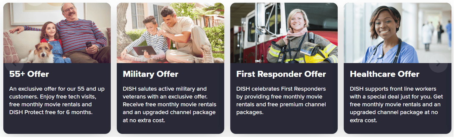 - 55+ customers: Customers 55 or older can get best-value pricing, plus free in-home tech support visits, one free movie rental monthly, and six months of Dish Protect Plus.