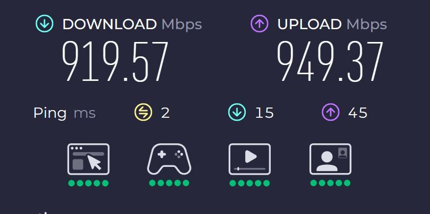 Wired speeds were right where they should be. On a desktop connected to one of the 10 Gigabit ports, I consistently got about 920 Mbps down and almost 950 Mbps up. That’s about as close to full gigabit as you can get without going over the limit of the plan itself.