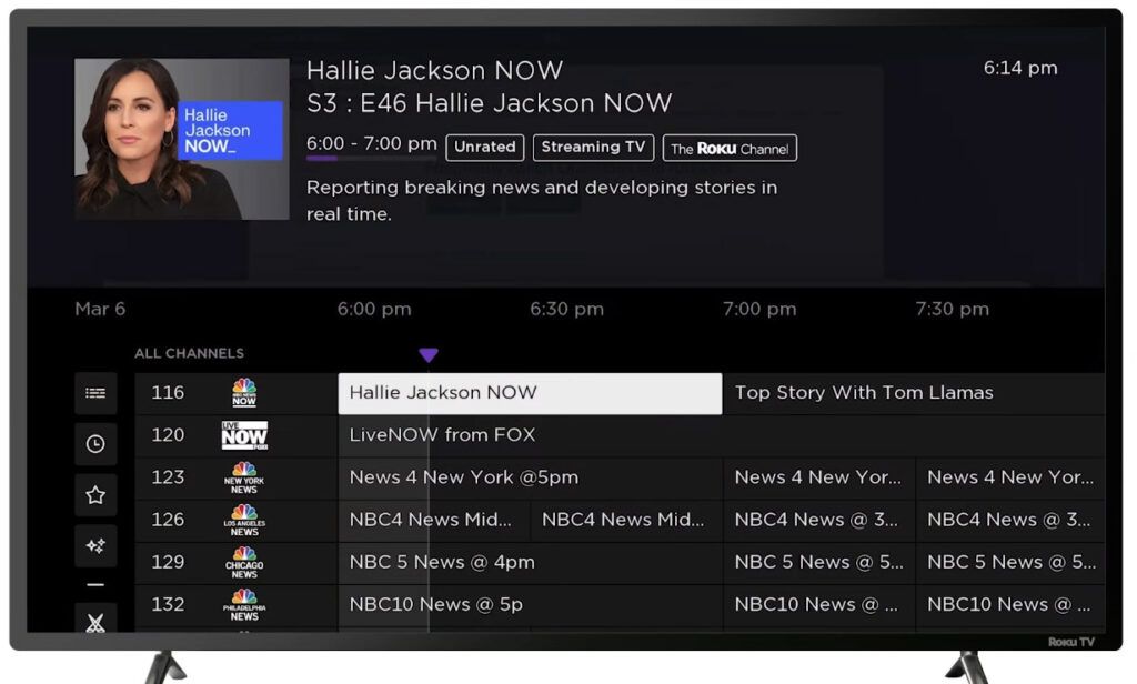 Roku devices give you access to The Roku Channel, where you’ll find over 500 free live TV channels that you don’t need a subscription for. When you visit the app from your Roku device, you can use the TV guide to see what’s on, browse through categories to find something new, and view any shows you’ve favorited to your account. The Roku Channel also lists recommended shows based on what you’ve watched previously. A few live channels available through The Roku Channel include: