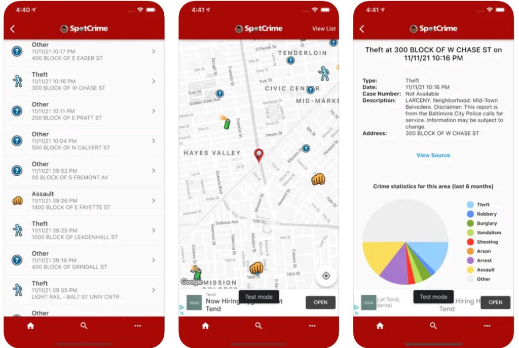 SpotCrime is a website and app where users can report crimes as they happen, allowing other users to stay up-to-date with crime in their area. The app also has a database of crimes it draws upon to update the map.