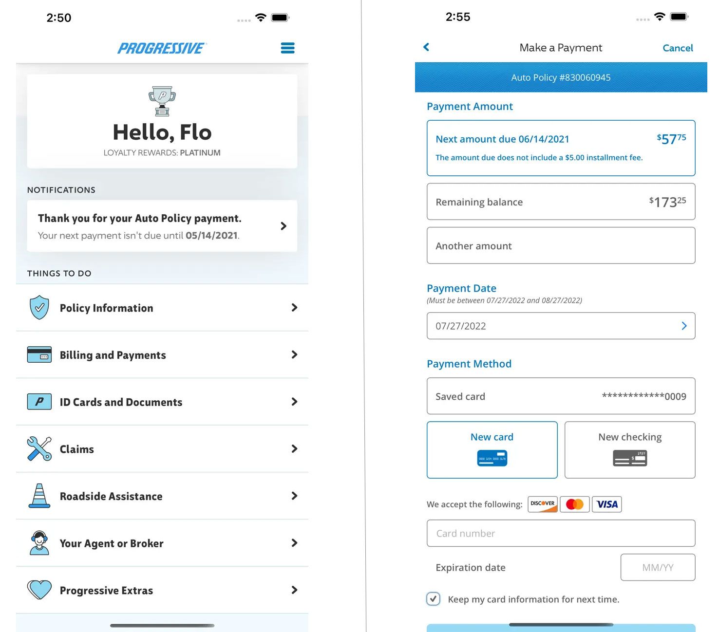 The Progressive mobile app is available for some Progressive customers, including most auto and motorcycle insurance policyholders, to help them manage their accounts on the go. Unfortunately, traditional homeowner’s and renter’s insurance policies are not included on the app, with the exception of mobile home insurance.