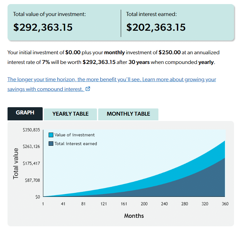 For example, if you invest $250 a month for 30 years at an estimated interest rate of 7%, you’ll have over $290,000 at the end of it all. And that’s only with $250 a month and never increasing your monthly contributions.