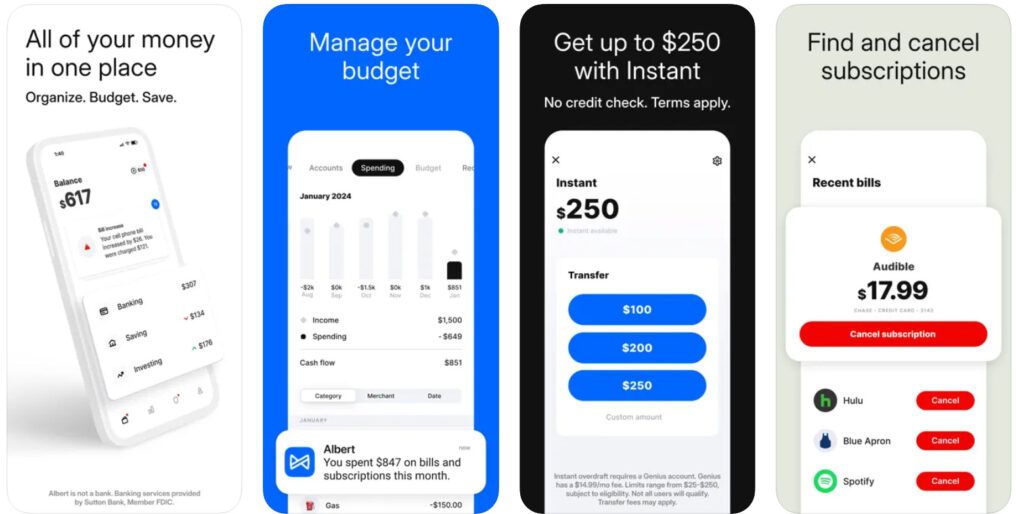 The Albert app offers users banking, savings, and investment accounts. It provides up to $250 in overdraft protection, allowing users to earn cash back on gas, groceries, and delivery services.