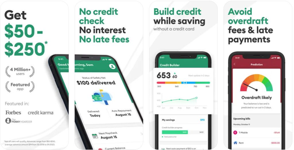 EarnIn is a financial services app that provides cash advances in addition to its credit monitoring and calculator tools. It offers users up to $750 per pay period ($100 per day) with no interest or mandatory fees. While it does request a tip for its services, it is completely optional. All you have to do is validate your earnings with a work email address or by enabling GPS tracking.