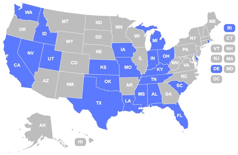 Possible Finance operates in the following states: Alabama, California, Delaware, Florida, Idaho, Indiana, Iowa, Kansas, Kentucky, Louisiana, Michigan, Mississippi, Missouri, Nevada, Ohio, Oklahoma, Rhode Island, South Carolina, Tennessee, Texas, Utah, and Washington.